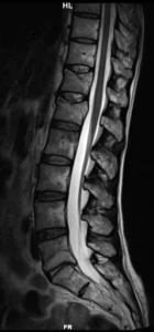 RM sagital en secuencias T2 (1), T1 (2) y STIR (3). La RM permite establecer qué se trata de un trauma reciente por la presencia de edema óseo (hiperintenso en secuencias ponderadas en T2, hipointenso en T1). Es el método de elección para evaluar la médula espinal, el cono y las raíces nerviosas. Adicionalmente, muestra la patología degenerativa discal y vertebral.
