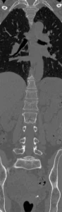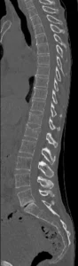 TC ventanas de partes blandas y óseas. MPR en planos coronal y sagital. Permite caracterizar mejor la fractura, confirmar la protrusión del muro posterior hacia el canal. Descartar hematomas epidural y paravertebral.